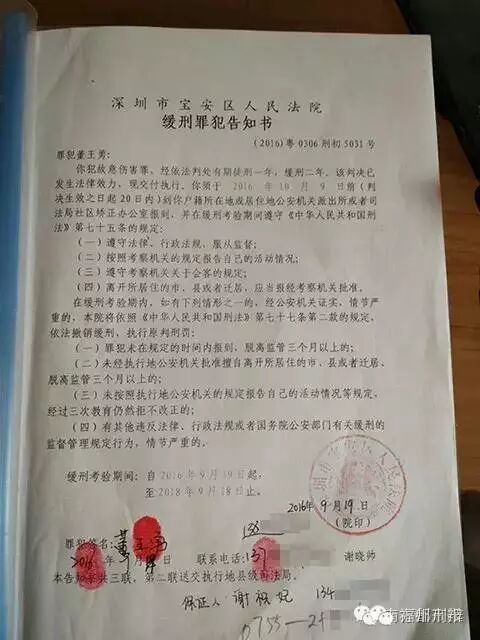 11月14日的下午,董王勇通过缓刑罪犯告知书上的号码,联系上谢祝妃。本来毫无头绪的董王勇,从谢祝妃口中得知是深圳龙华新区油松派出所办的案。