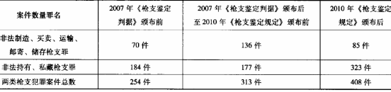 从上述统计数据可以发现以下几方面的信息:第一,《枪支鉴定判据》颁布前后,以非法制造、买卖、运输、邮寄、储存枪支罪和非法持有、私藏枪支罪这两个主要枪支犯罪论处的案件数量出现了重大变化,分别是254件和721件。第二,《枪支鉴定规定》宣布彻底废止2001年8月17日公安部发布的《公安机关涉案枪支弹药性能鉴定工作规定》规定的枪支鉴定标准,其颁布之前三年一个月(2007年10月29日至2010年12月6日)和颁布之后两年半(2010年12月7日至2013年3月28日)中的两类主要枪支犯罪的案件数量分别为313件和408件,数量增长较为明显。虽然上述案例不是我国全部涉枪犯罪的统计数据,但都是较为典型的案例,对我们认识枪支犯罪的现状具有较大的参考价值。由此可见,枪支犯罪案件的上述数量变化与枪支鉴定标准的变化存在关联。在局部地区,这种关联更为明显,例如:2009年至2011年,北京市西城区人民检察院受理的涉枪案件数量大幅增长:从2009年零发案、2010年2件涉枪案件、2011年7件,年平均增长率达225%,被告人均以为所涉及对象是“玩具”。[5]2010年至2012年北京市大兴区人民法院审理的10起涉枪案件中,接近90%被控“非法持有枪支罪”的案件皆起因于仿真枪的贩售和储藏,均是在查获仿真枪时发现其中部分达到了枪支鉴定标准,当事人因此被控以涉枪犯罪相关罪名。[6]