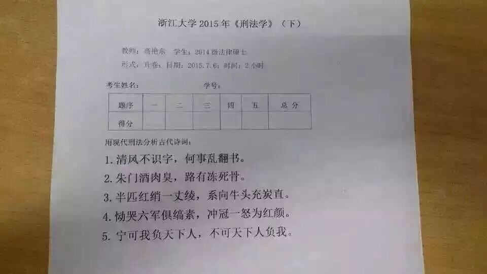 试卷上只有一道题:用现代刑法分析古代诗词,后面列举了五句人们耳熟能详的古诗词: